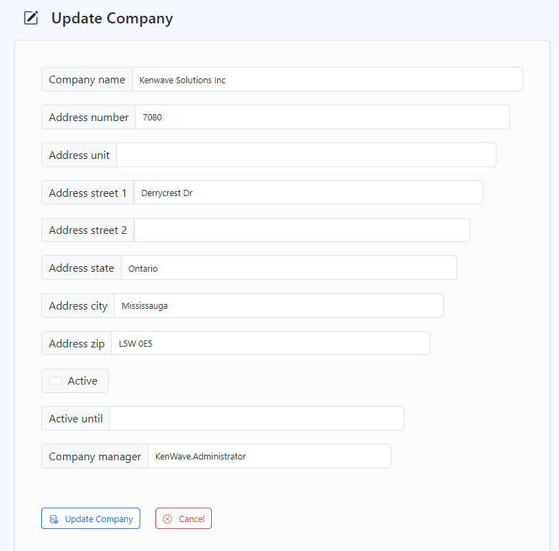 After clicking on the button, the Update Company page opens and shows a form. Change the desired form’s fields and click on the Update Company button at the bottom of the form to update the data.