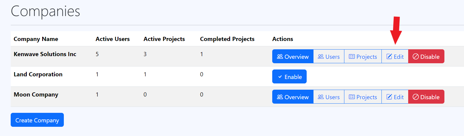 The Edit button on the Companies page opens a page for editing the selected company’s information.