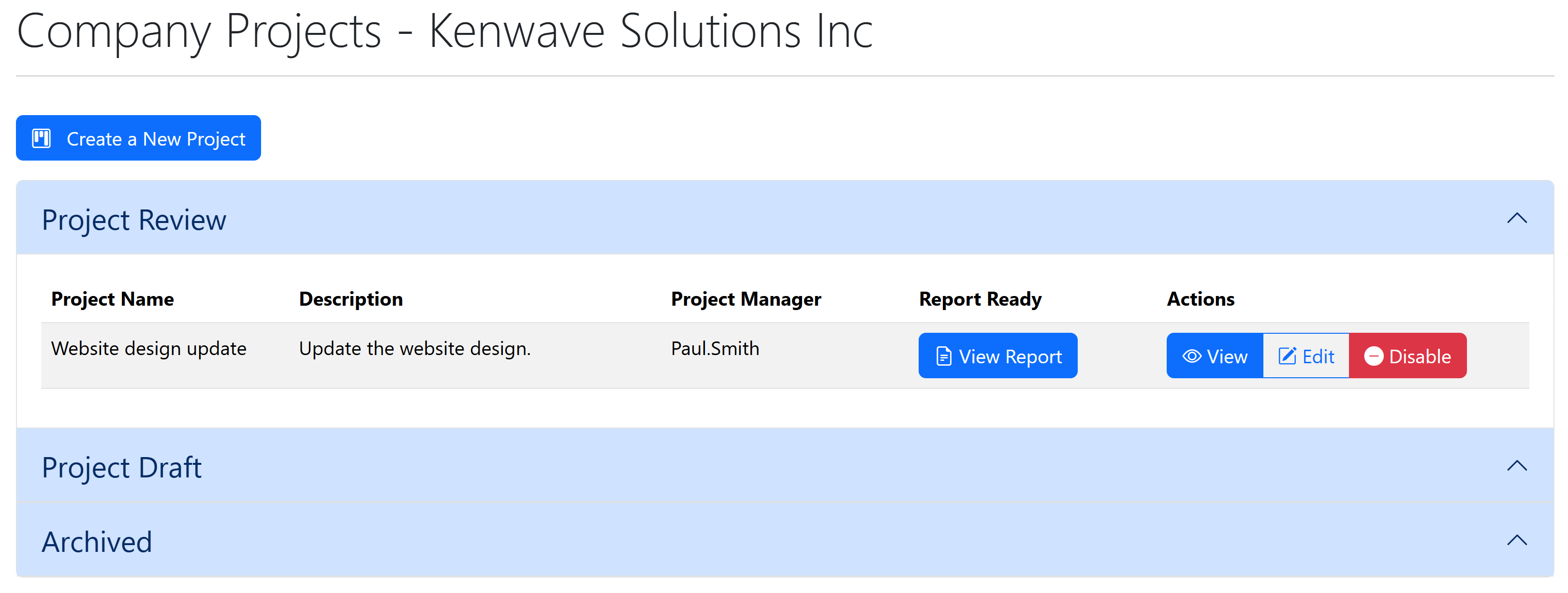 On the accordion, click on one of its sections’ titles to find the desired project. On the image below, the Project Review title was clicked to display the projects with this status.
