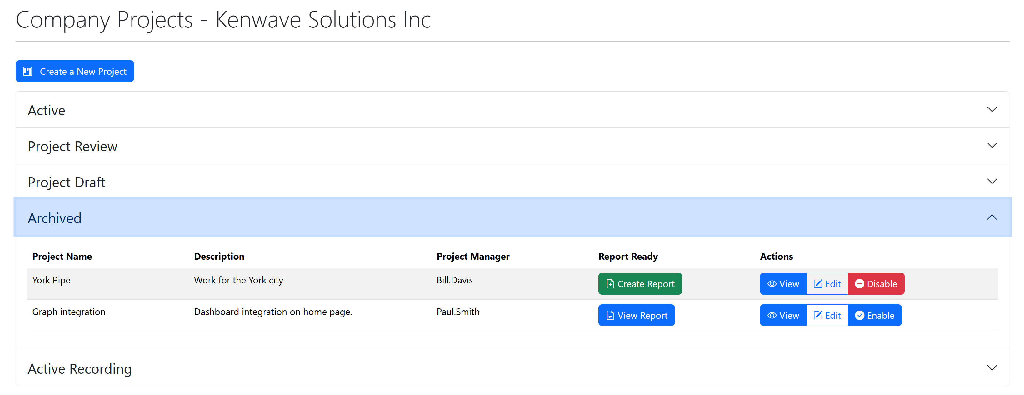 The figure below shows an example of the Company Projects projects of the KenWave Solutions Inc company.