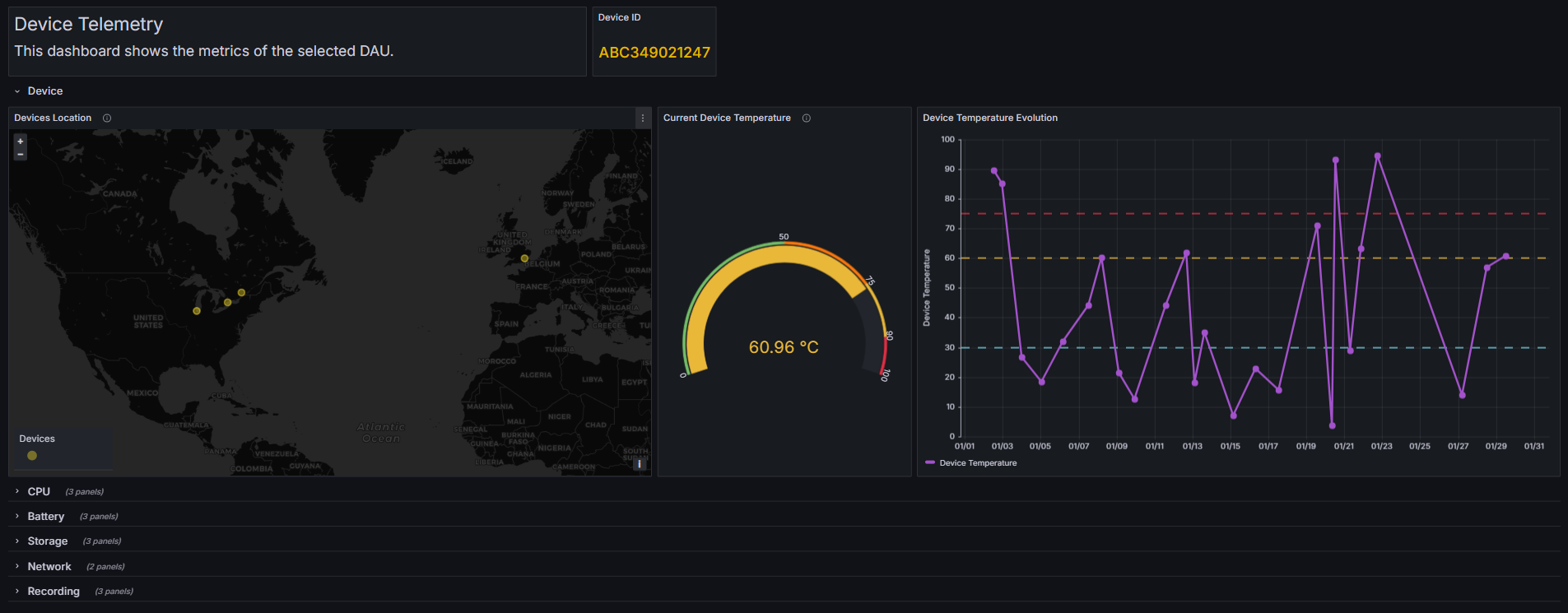 The Details buttons on the Device Telemetry page opens the respective Device Telemetry Details page, where it is possible to observe the metrics for different recording times.