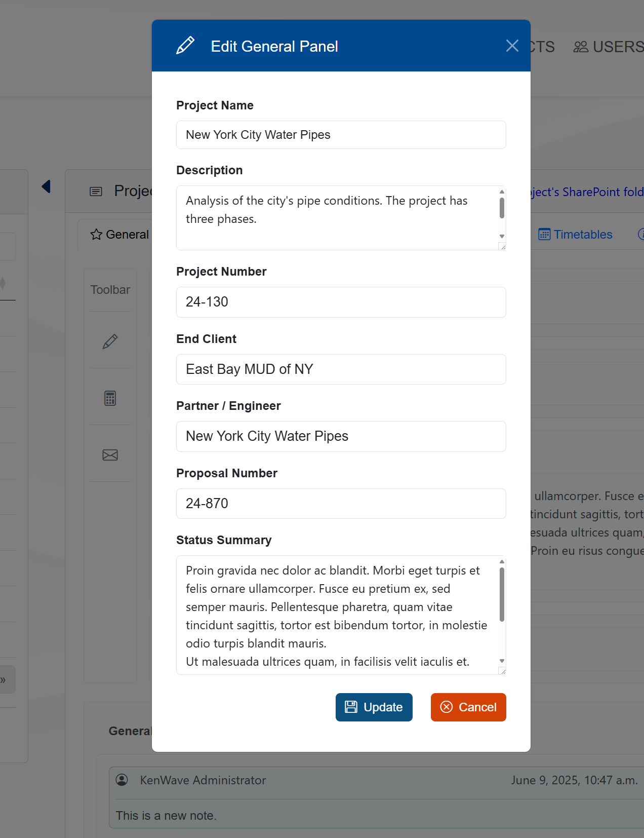 This will enable the fields for editing on a modal window. After making changes, click on the Update button to save your modifications; click on the Cancel button to discard any changes.