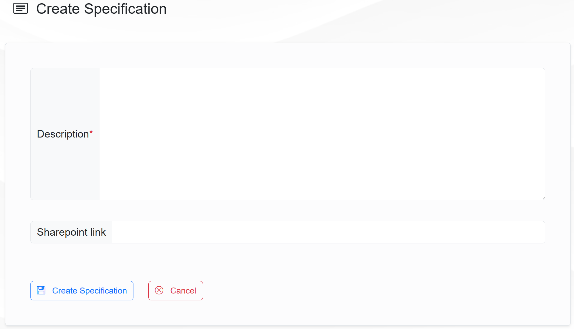 To create a new specification, click on the button Add Specifiaction. The Create Specification page will apeear, allowing the user to enter the details of the new specification.