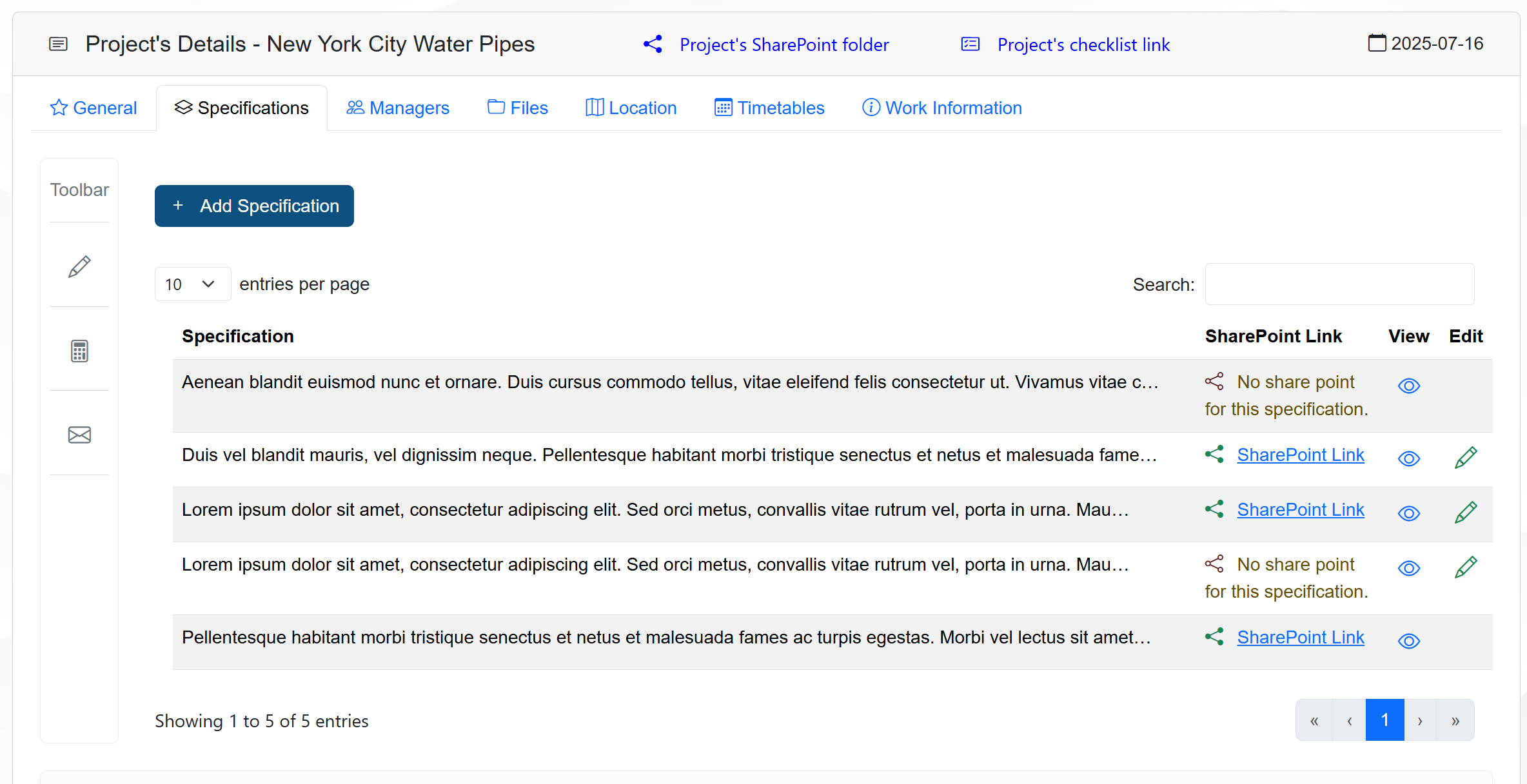 The Specifications tab on the Management page allows the user to view, create, and edit specifications for the selected project.