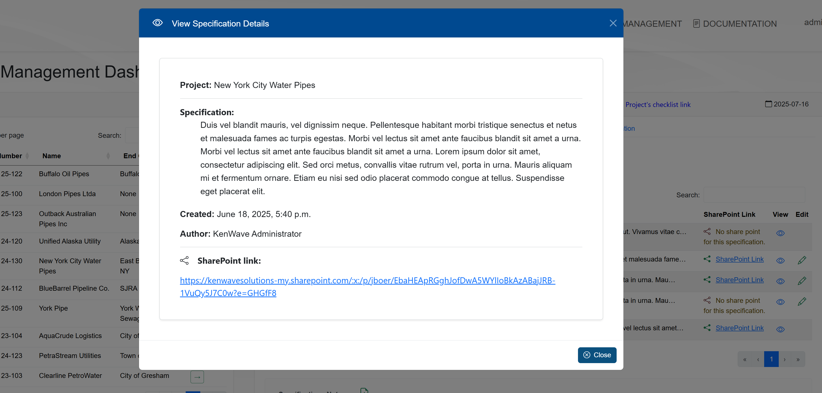 To view a specification, click on the View icon on the specification line. The View Specification Details modal window will appear, allowing the user to view the details of the specification.