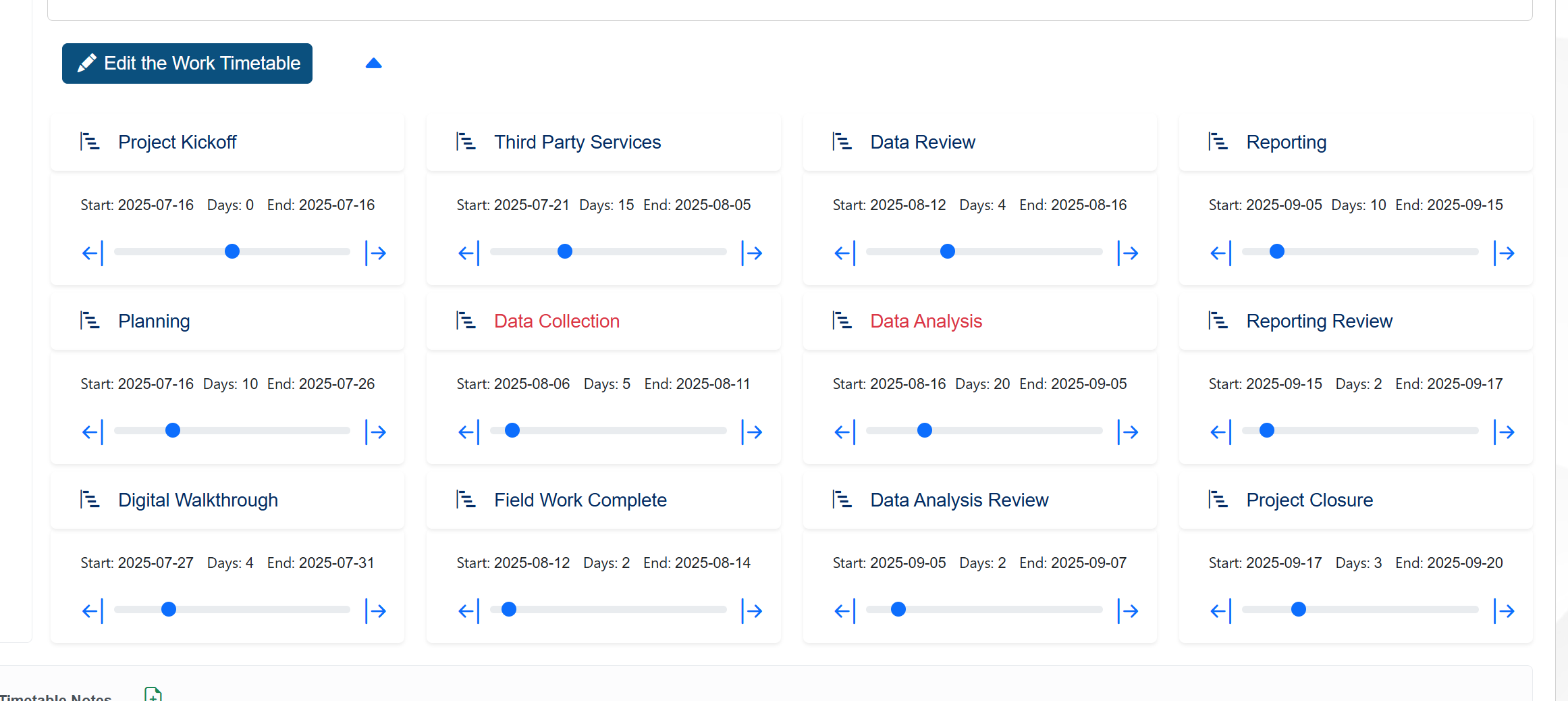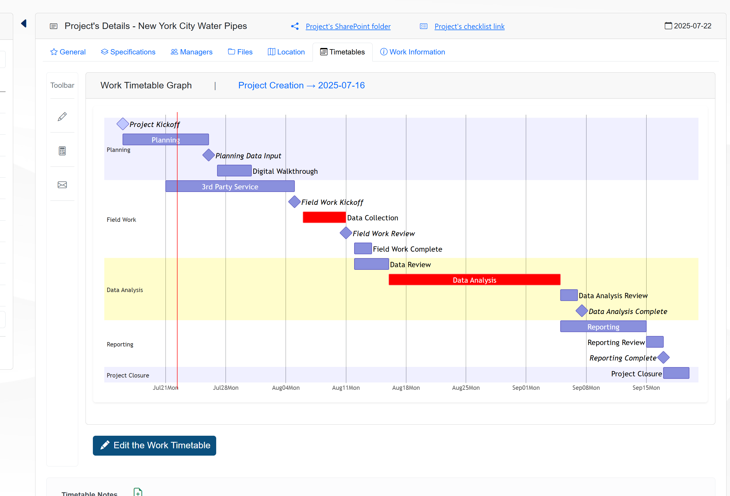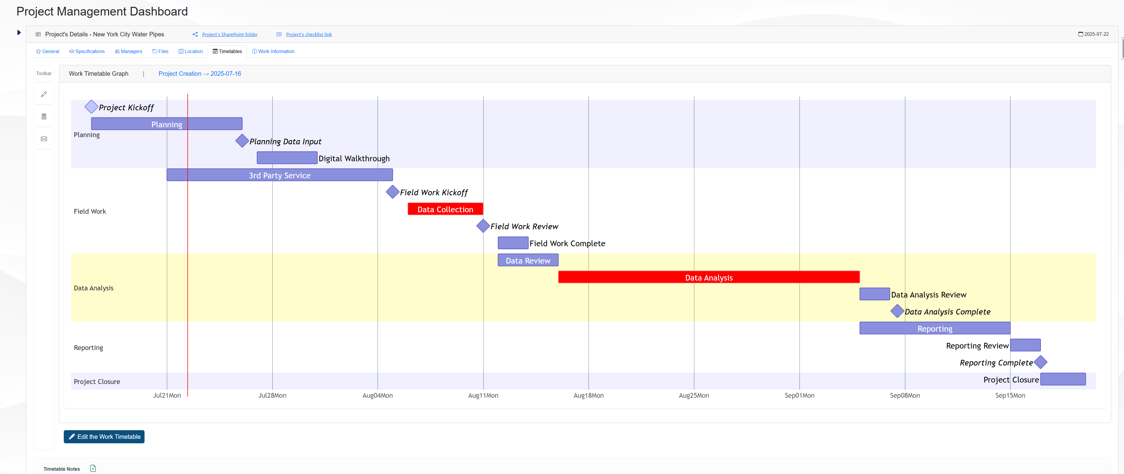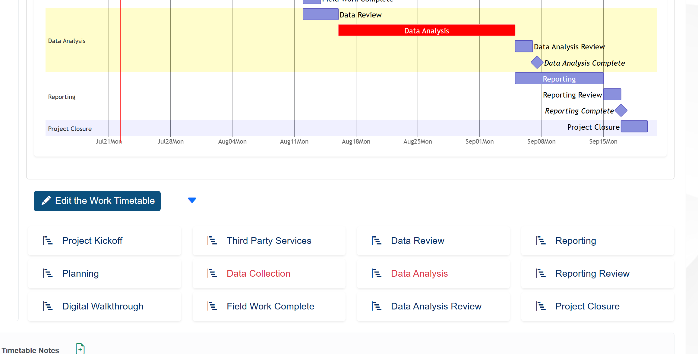 The Timetables tab on the Management page allows the user to get information about the project’s planning showing the tasks on a Gantt chart.