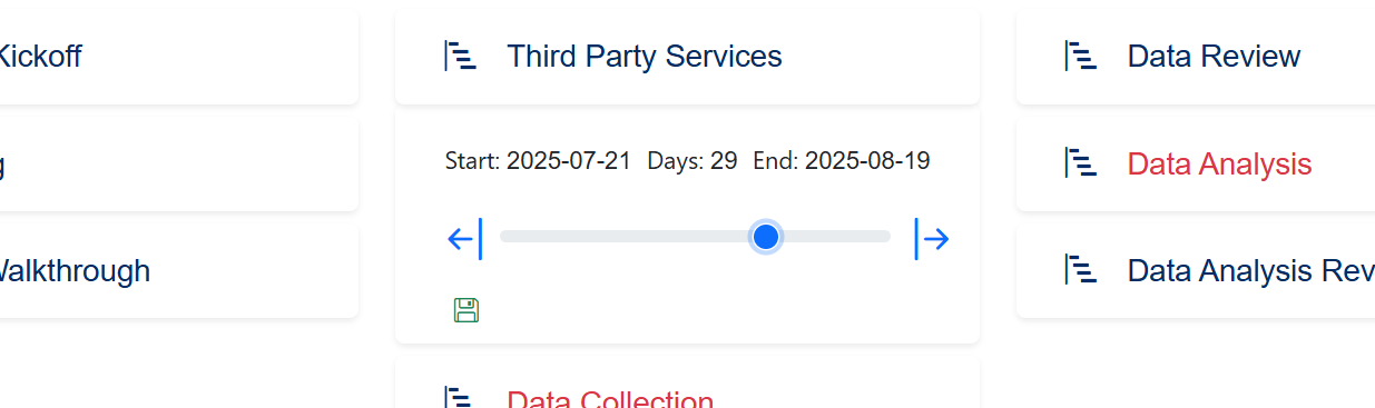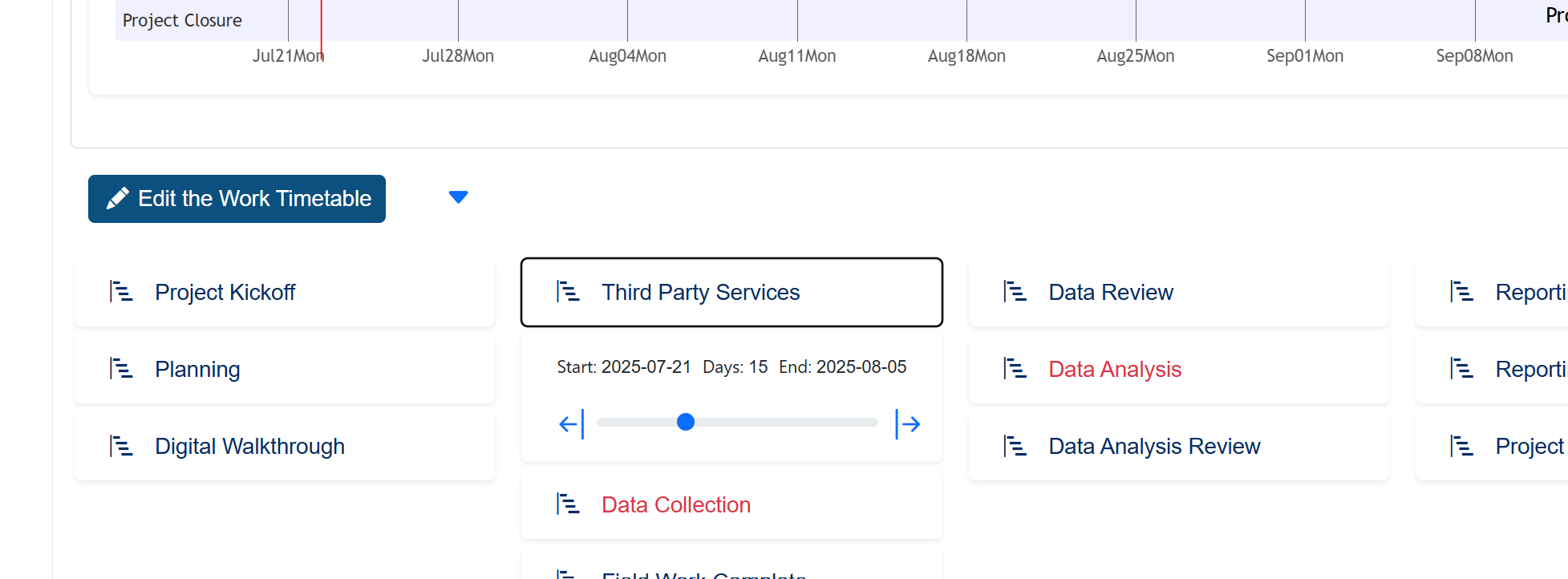To change the task or milestone, drag the slider or use the arrow icons. When the task or milestone is changed, the Gantt chart is updated automatically. The figure below displays an example of the updated Gantt chart after changing the Third Party Services task.