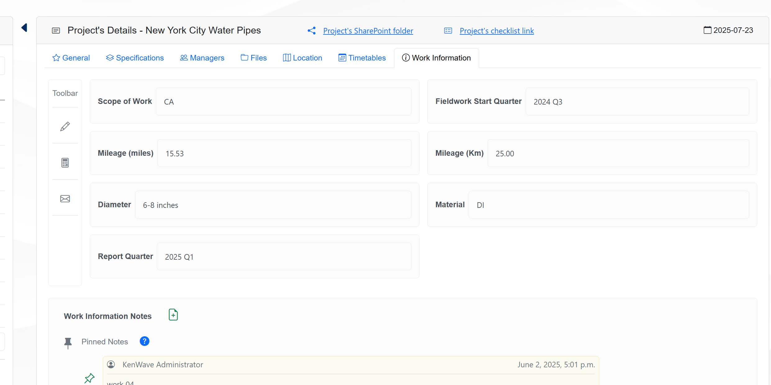 The Work Information tab on the Management page allows the user to get the following project’s information: